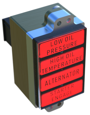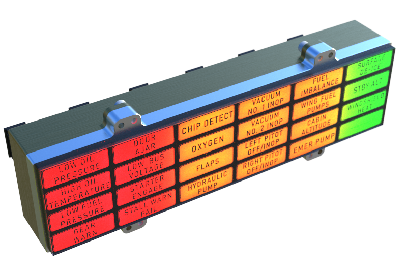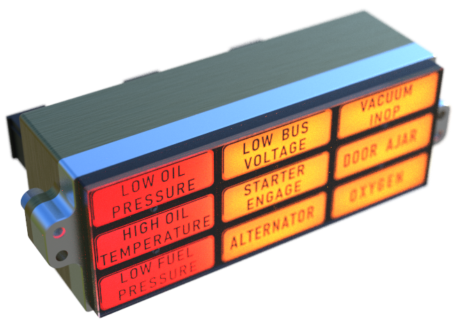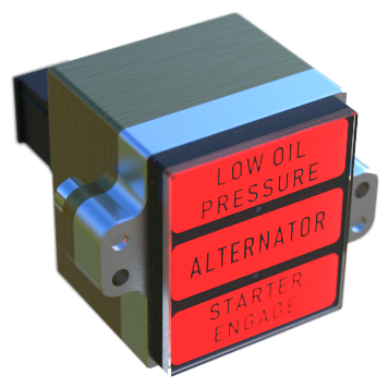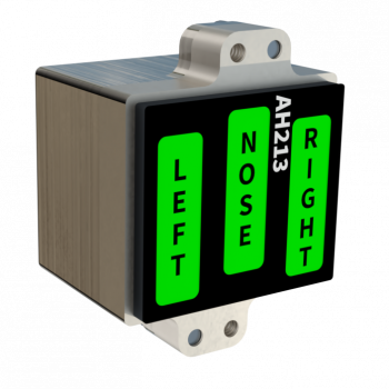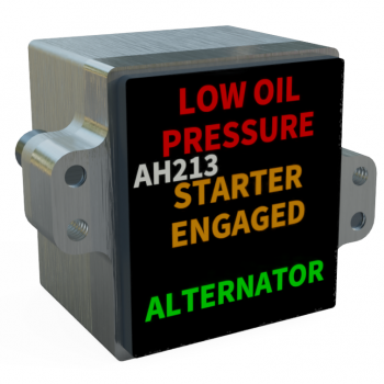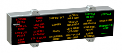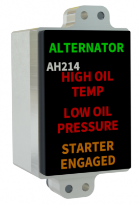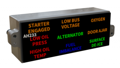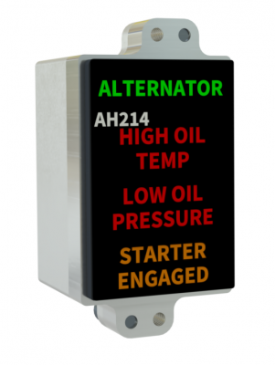 The AH2xx is a range of 3, 4, 9 and 24 channel “dumb” annunciators providing sunlight readable LED illuminated custom captions with a switchable dim / bright function. Each caption has 6 bright LEDs available in Red, Amber, Green, Blue or White in any combination. It is available for use with power supply voltages between 11 and 32 volts and has built in over voltage, under voltage, reverse polarity and inrush current protection. All inputs are factory programmable to be either active high or active low depending on customer requirements.